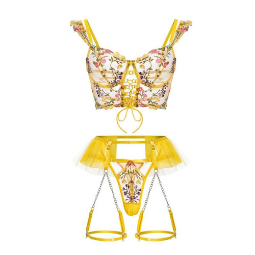 Set Daisy – Lencería Amarilla de Encaje con Liguero y Cadenas