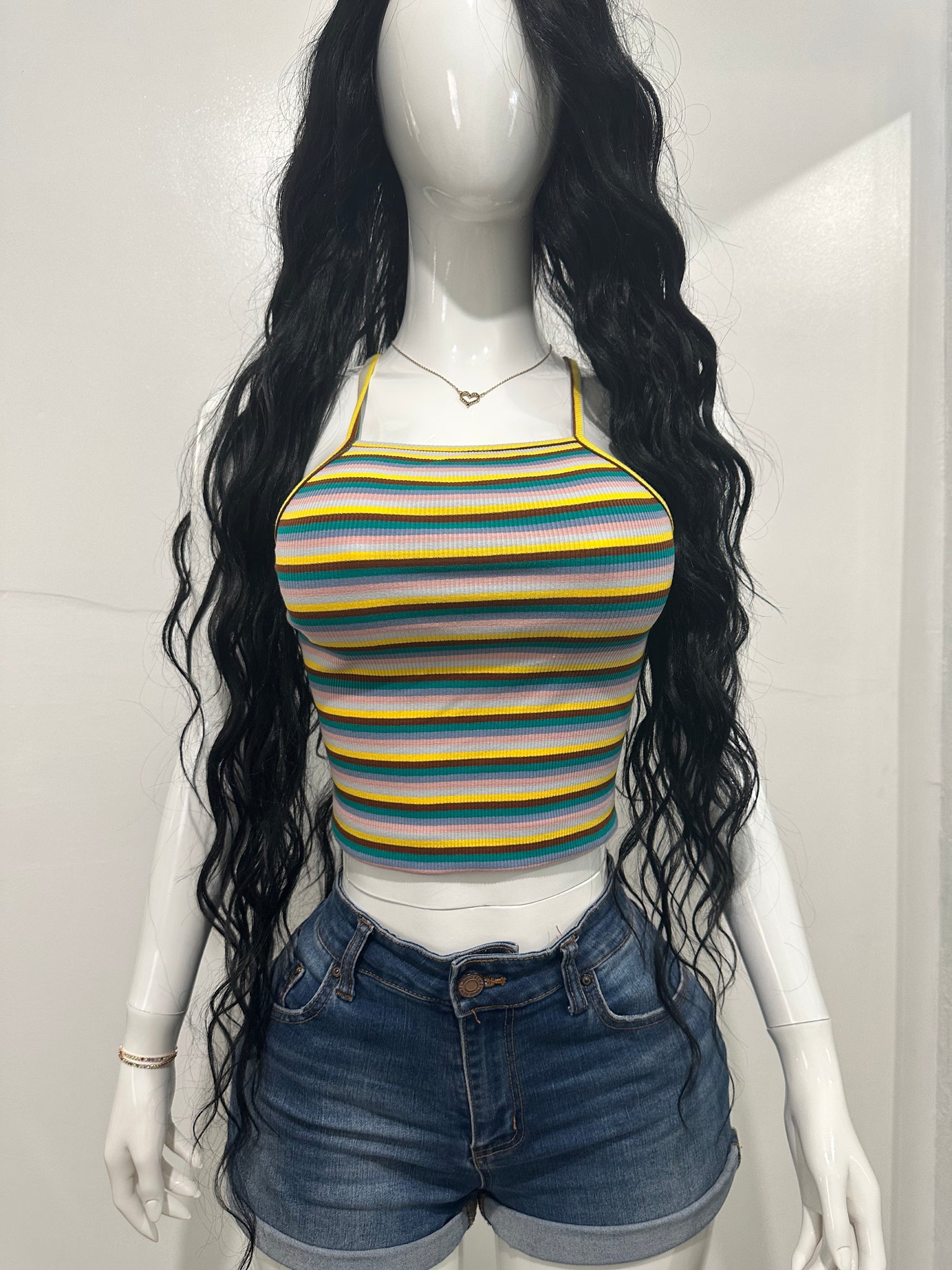 Este top halter multicolor tiene tirantes finos cruzados en la espalda y un diseño ajustado que realza la silueta sin perder comodidad. Su estampado de rayas en tonos vibrantes lo hace ideal para looks relajados y llenos de personalidad.